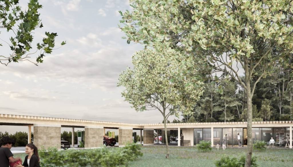 »Nadstrešnice polnilnic s fotovoltaičnimi celicami in javni prostori bodo zgrajeni iz lesa, po obodu osrednjega atrija pa bodo nadstrešnice podprte s slopi iz zbite zemlje. Polnilni park z ozelenjenim osrednjim atrijem omogoča uporabnikom umik od stika z vozili, tako značilnega za obcestna počivališča, ter obenem vzpostavlja jasno ločnico med območji za tovorni in za osebni promet – na prostor bližje in dalje od regionalne ceste,« so še sporočili z Elesa.
