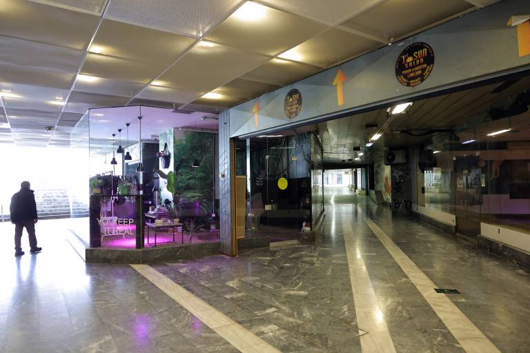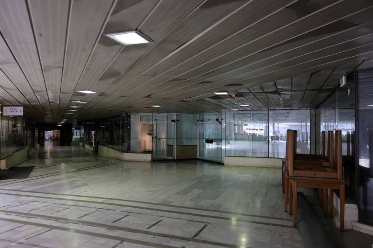 Tam sicer deluje še nekaj trgovin, ki jih je je skozi prazen labirint zaprtih trgovin, smeti na tleh, videli smo tudi igle, prav težko najti. V enem kotu je spal človek, verjetno narkoman.