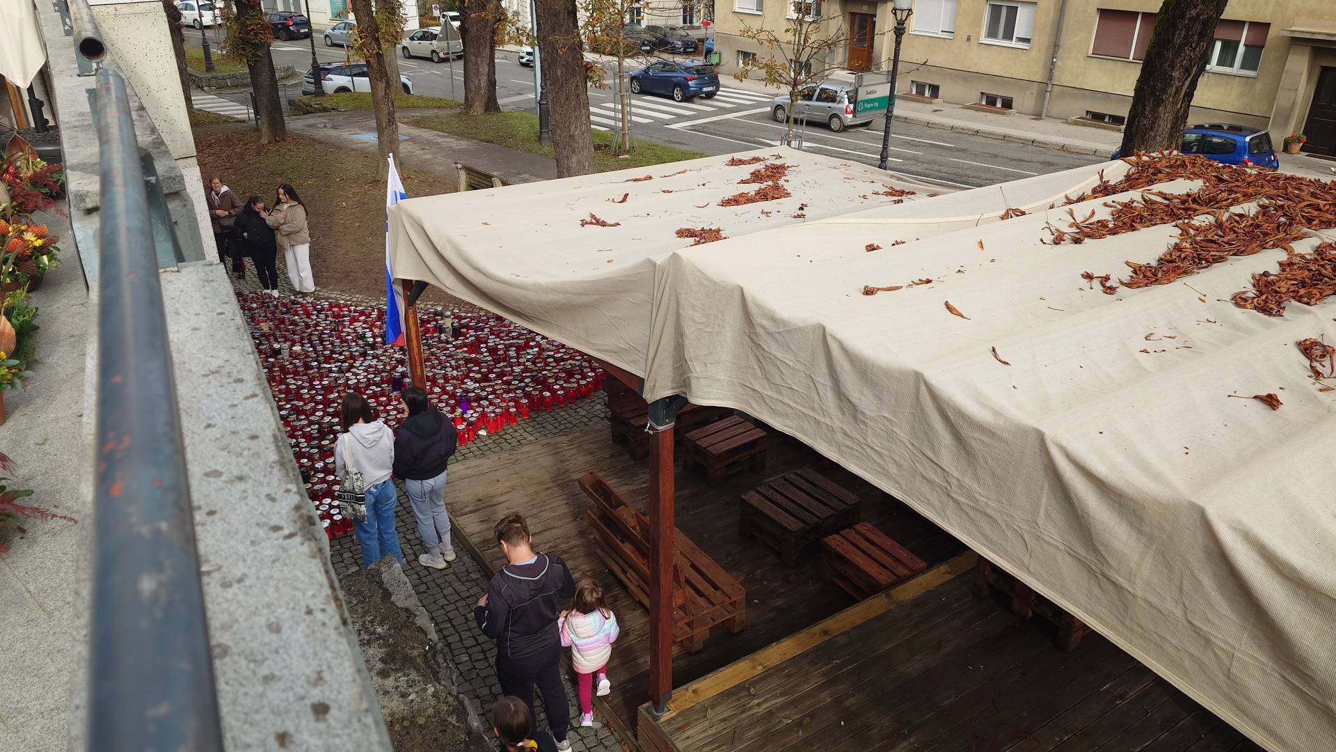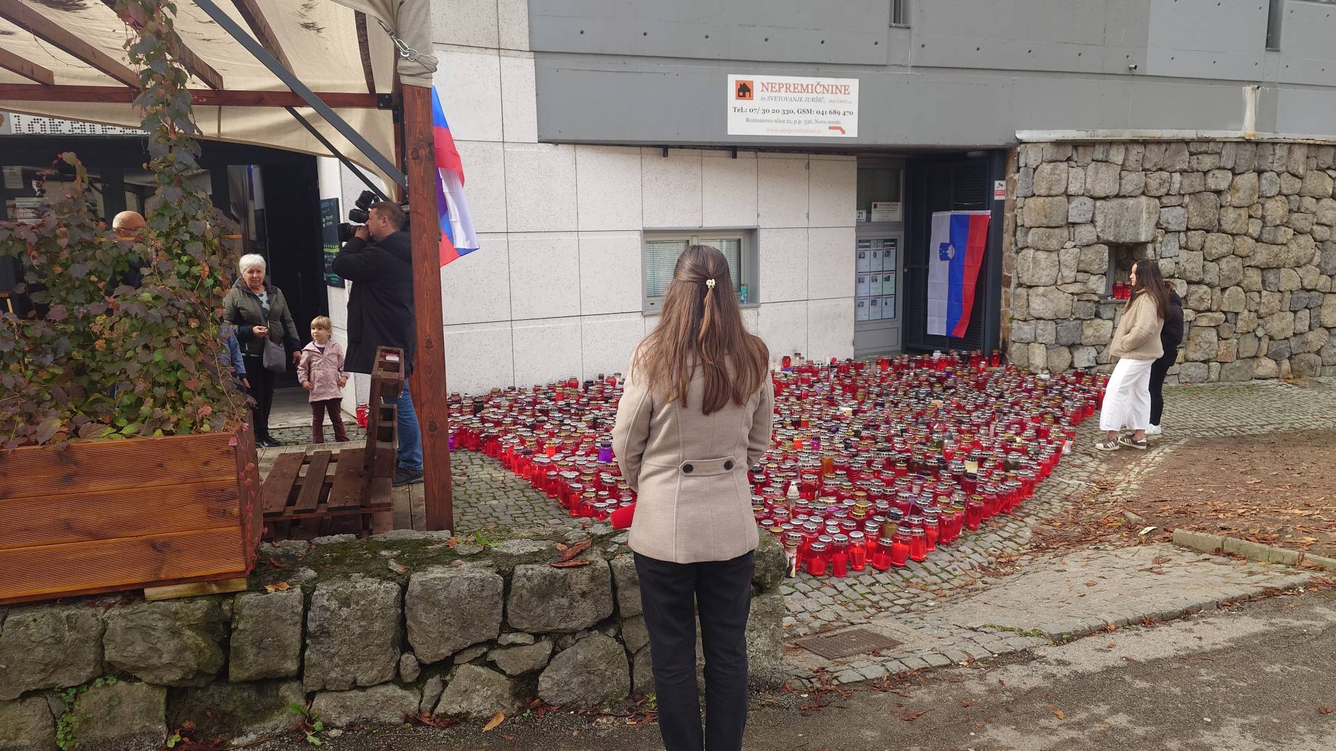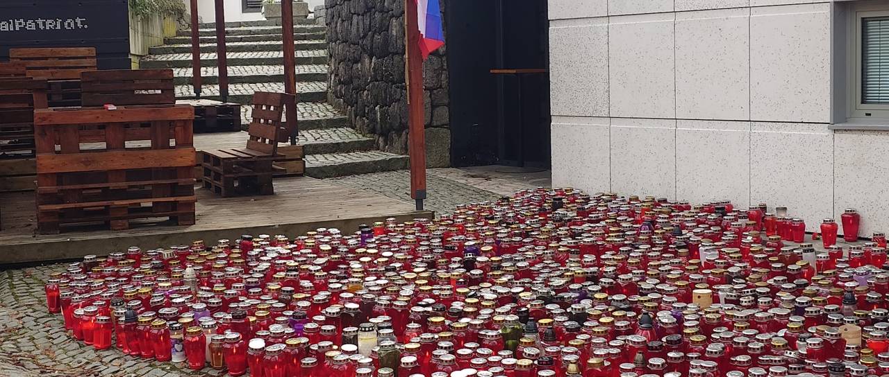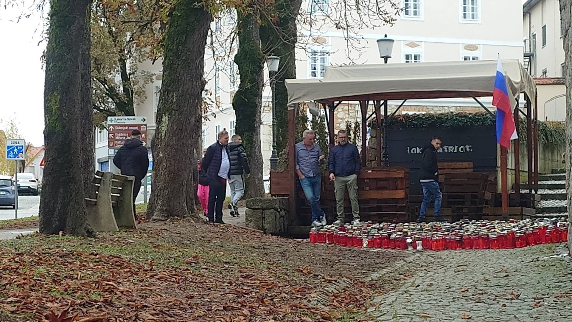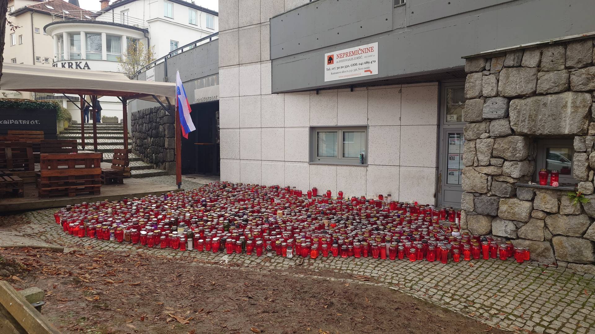Pred Lokalom Patriot so žalujoči, z občinske stavbe pa visi črna zastava.
