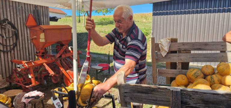 Darinkin mož Karel Cör je dolga leta vozil avtobus, danes pa se posveča bučam. Za obdelavo je izdelal svojo napravo.