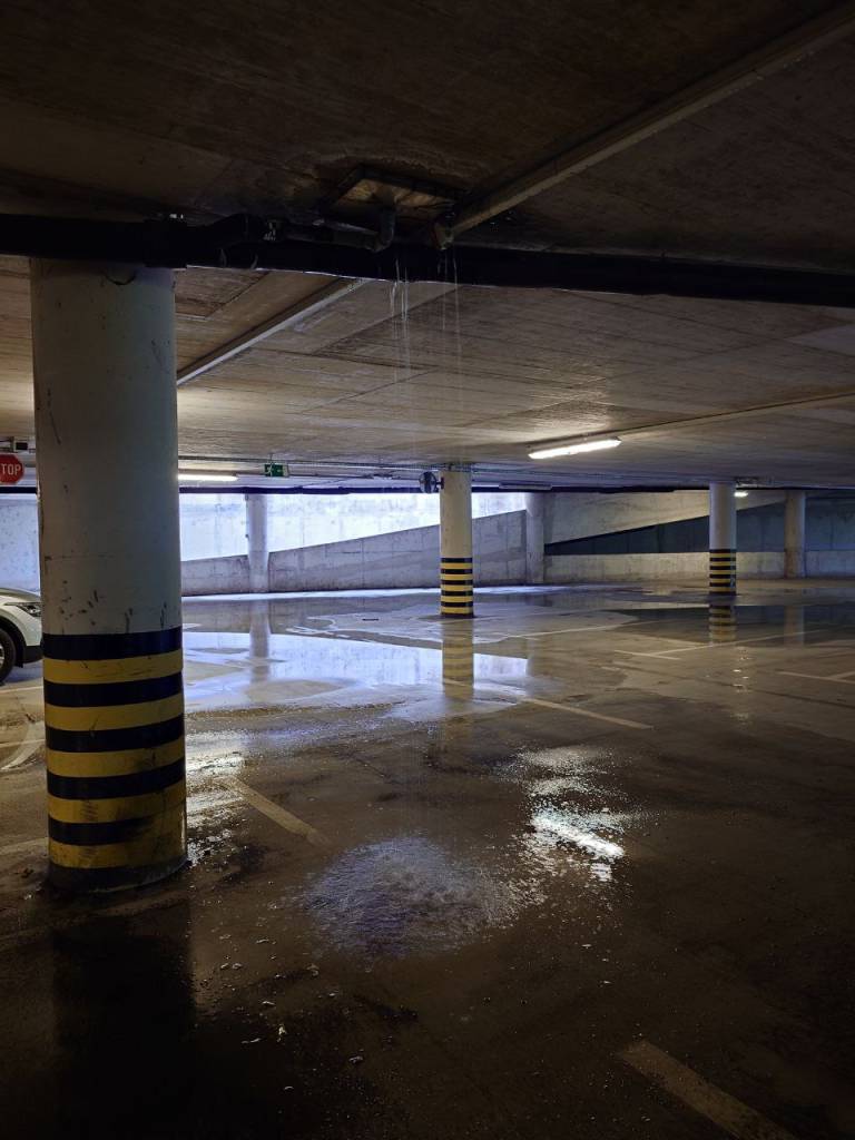 Poplavljena je bila tudi garažna hiša pri Portovalu oziroma nakupovalnem centru Tuš. Objektu, ki je znan po tem, da začne zamakati že ob manjših nalivih, tudi tokrat ni bilo prizanešeno.