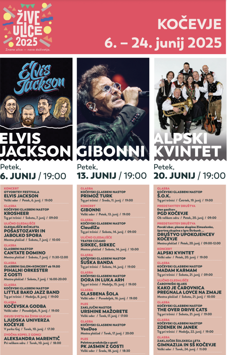 Kočevje bo med 6. in 24. junijem že četrto leto znova prizorišče priljubljenega festivala Žive ulice, ki v mesto prinaša vrhunske koncerte, ulično umetnost, gledališče, ples, ustvarjalne delavnice in sproščeno druženje. Pestro dogajanje, ki bo skorajda vsak dan - tudi večkrat na dan - poskrbelo za vsak okus vseh generacij.