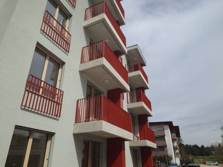Vsako stanovanje ima svoj montažni konzolni pokriti balkon in pripadajočo shrambo.