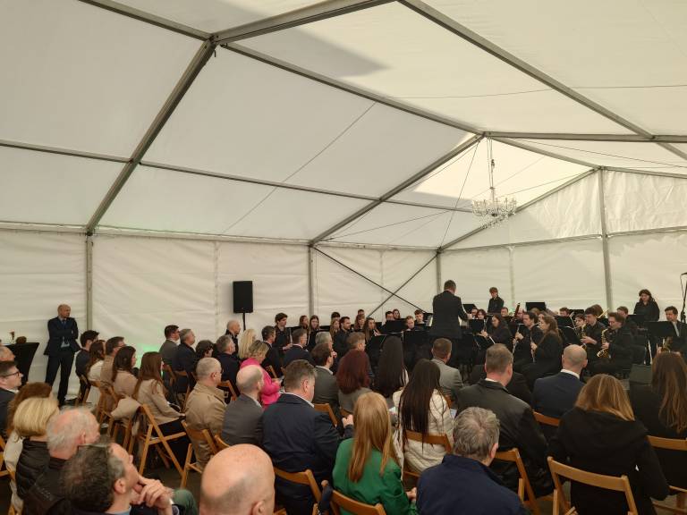 Ob spremljavi Pihalnega orkestra Novo mesto so zbrane nagovorili tudi novomeški župan Gregor Macedoni, predsednik uprave stanovanjskega sklada Črtomir Remec in predsednik vlade Robert Golob.