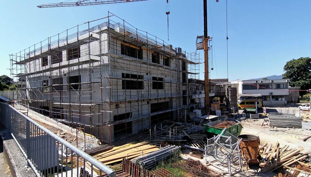 Junija so gradbinci uspešno dokončali stropno ploščo nad drugim nadstropjem, trenutno pa potekajo inštalacijska dela in urejanje notranjih prostorov.