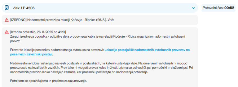 Zaradi odtujitve dela progovnega kabla bo na železniški relaciji Kočevje – Ribica od 26. avgusta organiziran nadomestni avtobusni prevoz.