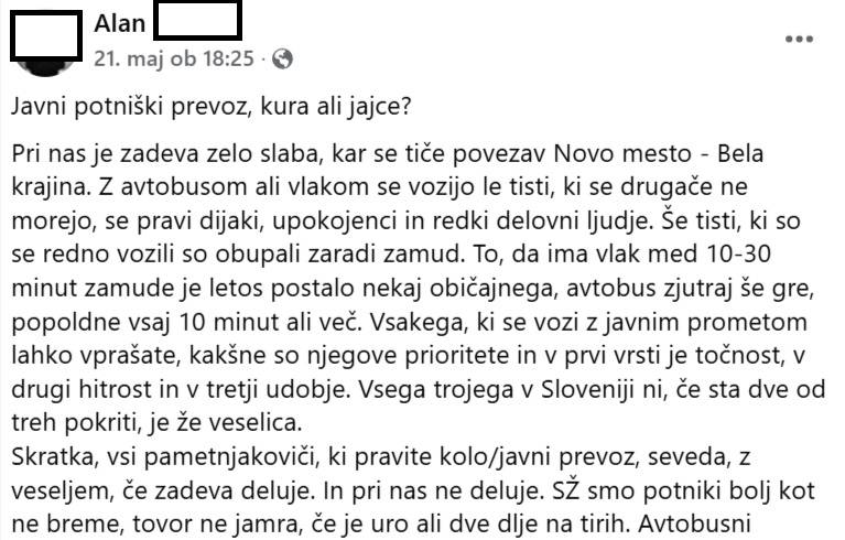 Alan je na Facebooku izpostavil slabosti javnega prevoza med Novim mestom in Belo krajino. Pravi, da bi z veseljem uporabljal avtobus ali vlak, tako kot to spodbujajo lokalne skupnosti in okoljsko ozaveščeni.