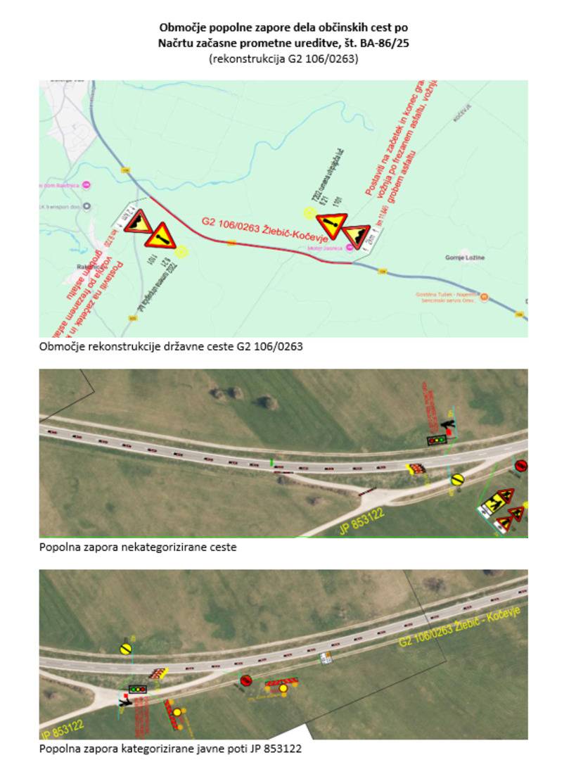 V tem času bo zaradi rekonstrukcije državne ceste predvidena popolna zapora dela javne poti JP 853122 in dela nekategorizirane javne poti, ki se priključujeta na ta odsek.