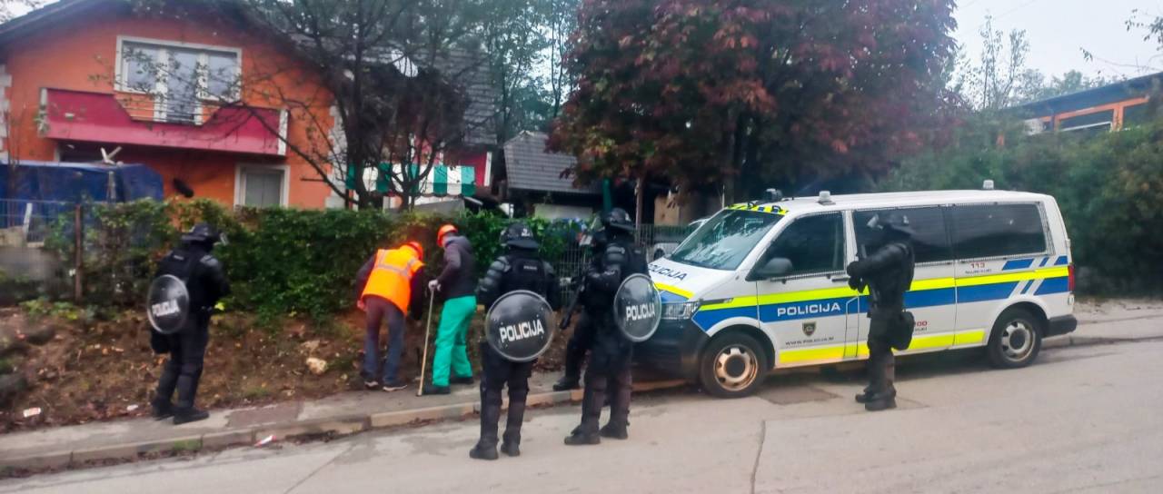Komunalne delavce v romskem naselju spremlja policija.