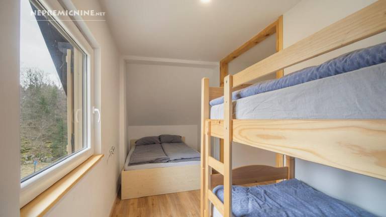 V notranjosti je nameščeno novo pohištvo – klopi, mize, postelje in jogiji – kar pomeni, da je koča vseljiva takoj, brez dodatnih vlaganj.