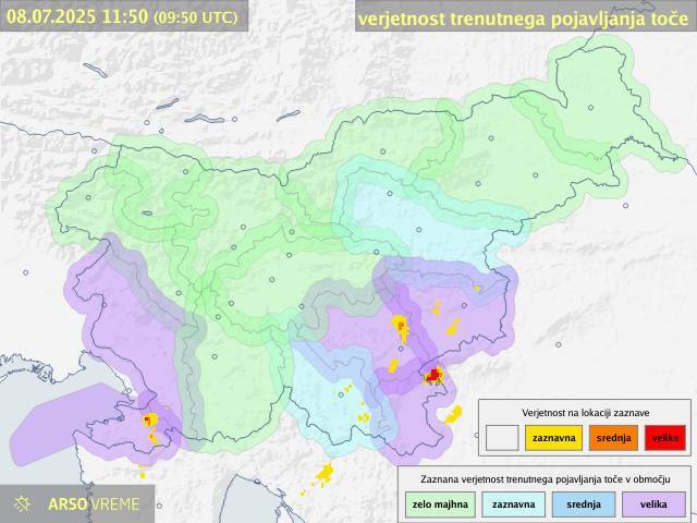 Od zjutraj je bilo nekaj močnejših neviht tudi na jugu države, okoli poldneva pa je bila velika verjetnost trenutnega pojavljanja toče razglašena za območje Bele krajine.