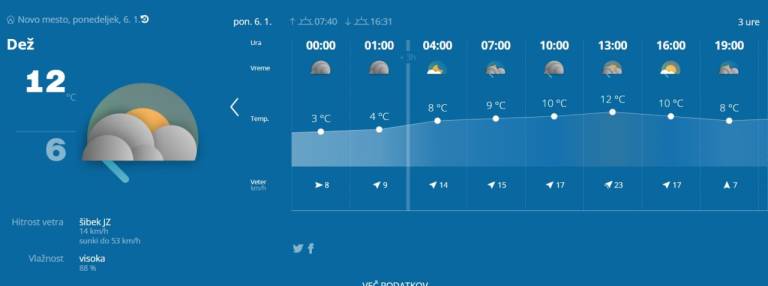 Agencija Republike Slovenije za okolje napoveduje, da bo na Dolenjskem in okolici hitrost vetra dosegla do 14 kilometrov na uro, sunki pa bi naj dosegli tudi do 53 kilometrov na uro.