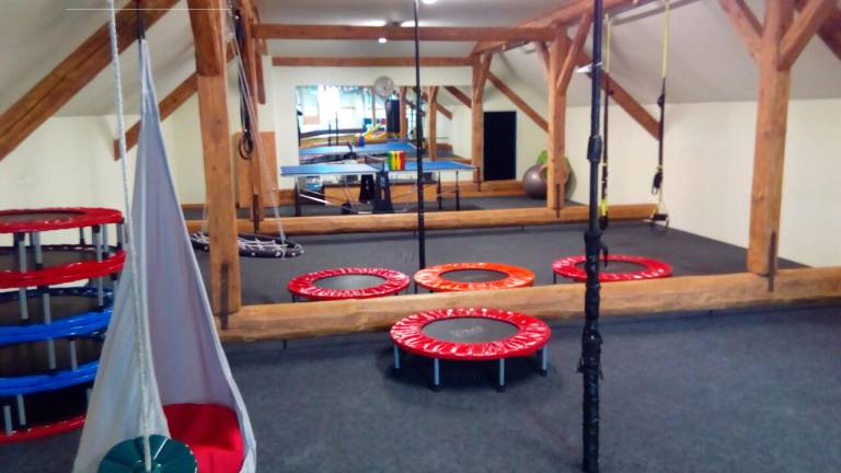 Na podstršju je postavljena nizka plezalna stena in miza za igranje namiznega tenisa, urejena pa je tudi otroška igralnica za praznovanje rojstnodnevnih zabav. V pritličju je recepcija s priročnim barom, garderobo za badminton, prostor za sprostitev z dvema solarijema, infra savno in masažnim stolom, v prvi etaži pa sta ženska in moška garderoba s tušem.