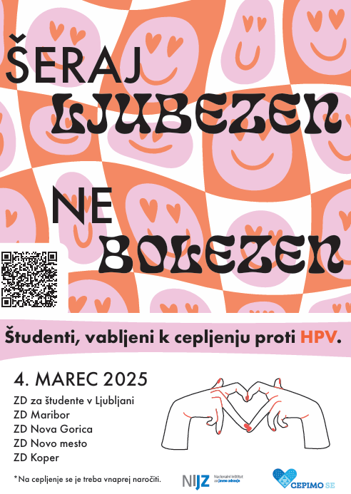Cepilni dan za študente proti HPV pod sloganom Šeraj ljubezen, ne bolezen bo 4. marca v Zdravstvenem domu za študente v Ljubljani in zdravstvenih domovih Maribor, Novo mesto, Nova Gorica in Koper.