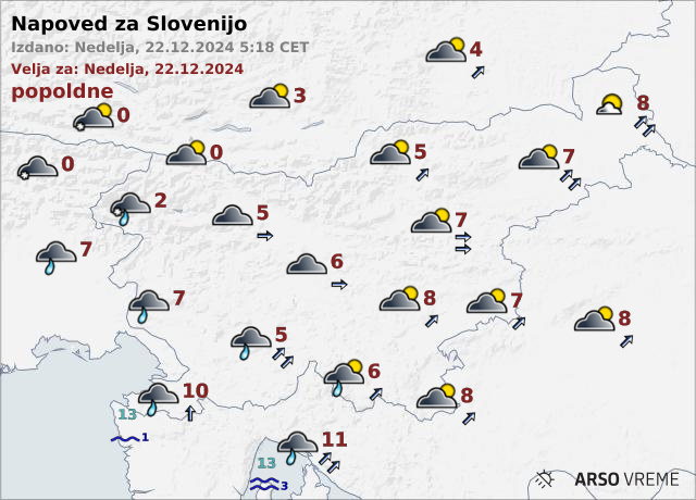 Najvišje dnevne temperature bodo od 5 do 10, na severozahodu okoli 1 stopinja Celzija, je zapisano na spletnih straneh Agencije Republike Slovenije za okolje.