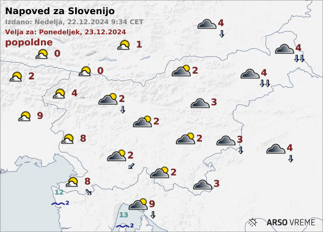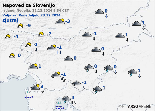 Jutranje temperature bodo od okoli ledišča, v alpski dolinah okoli -7, ob morju 4, najvišje dnevne od 0 do 4, na Primorskem okoli 8 stopinj Celzija.
