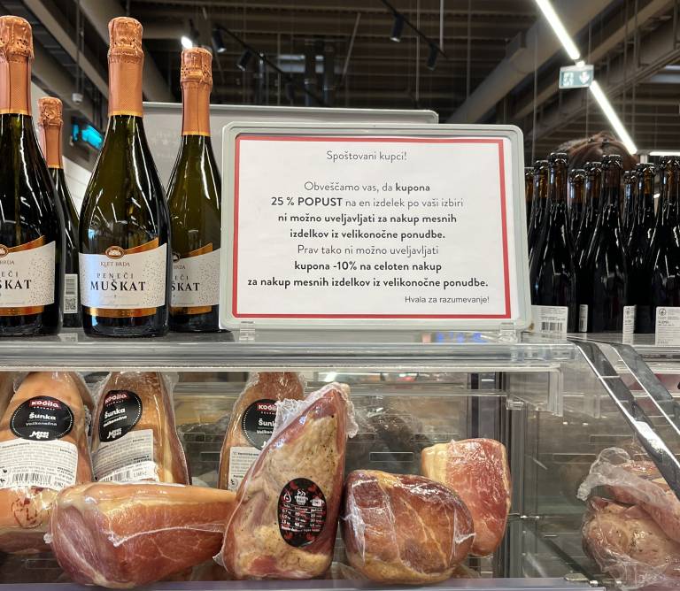 Cene so precej visoke, oznake ob policah z velikonočnimi izdelki pa kupce opozarjajo, da na te izdelke ni mogoče uveljavljati dodatnih popustov ali kuponov.