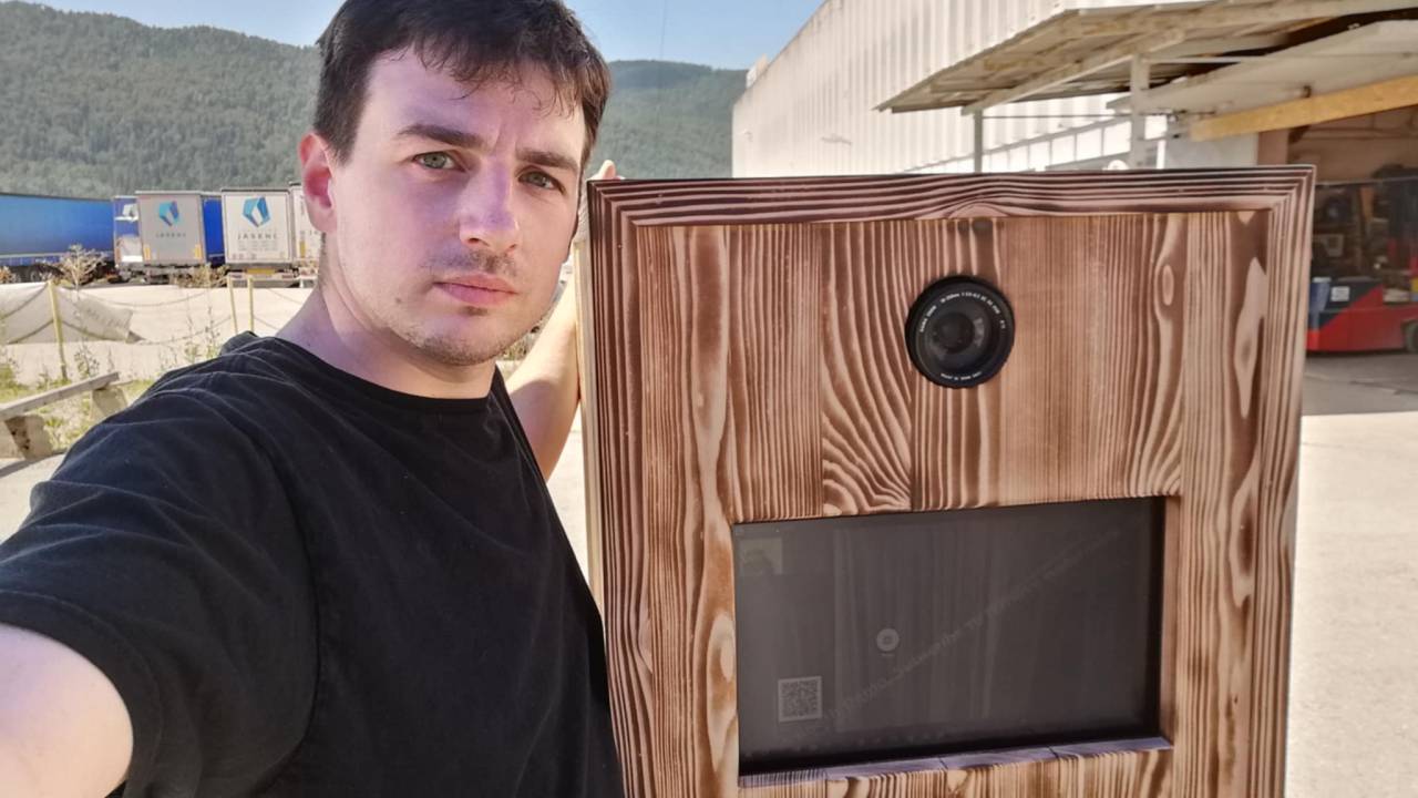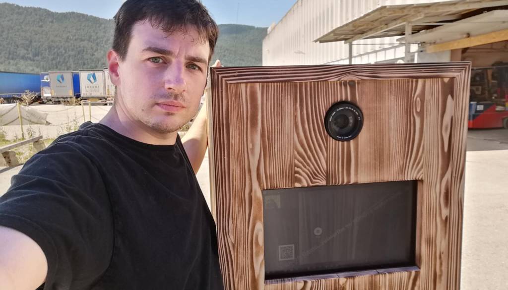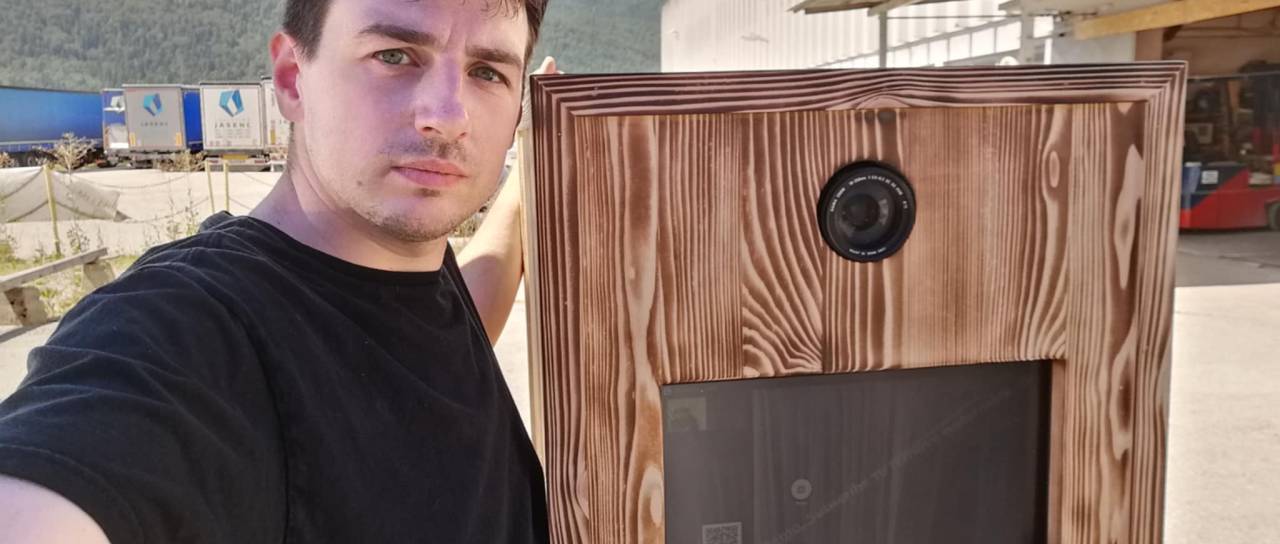 Tako zadevo - pri meni zapakirano v lično leseno škatlo - le postaviš na pult, mizo, stol ali celo na tla in vse je pripravljeno za fotografiranje. Nato samo še pritisneš na gumb in fotografija je posneta. Lahko jo natisneš takoj, lahko pa potem izbereš nekaj najljubših in jih natisneš naknadno, saj se fotografije shranjujejo,« celoten - sicer nekaj sekundni postopek - opiše Patrik.