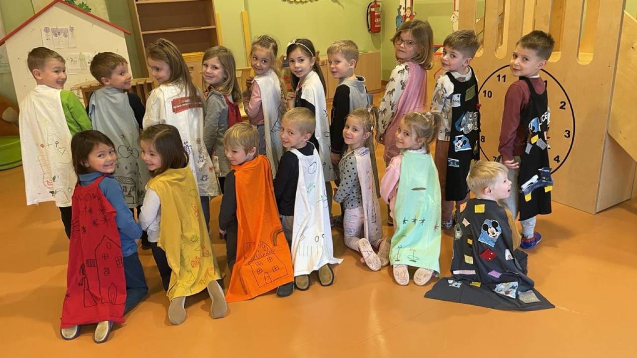 »V sklopu Eko projekta – Ne zavrzi oblek, ohrani planet! smo izvedli ustvarjalni delavnici. Najprej smo iz starih majic mamic in očkov izrezali prava junaška ogrinjala. Otroci so jih z barvami za tekstil porisali z motivom po svojih željah. Nekateri pa so na ogrinjala raje lepili odpadne kose blaga,« so zapisali v vrtcu.