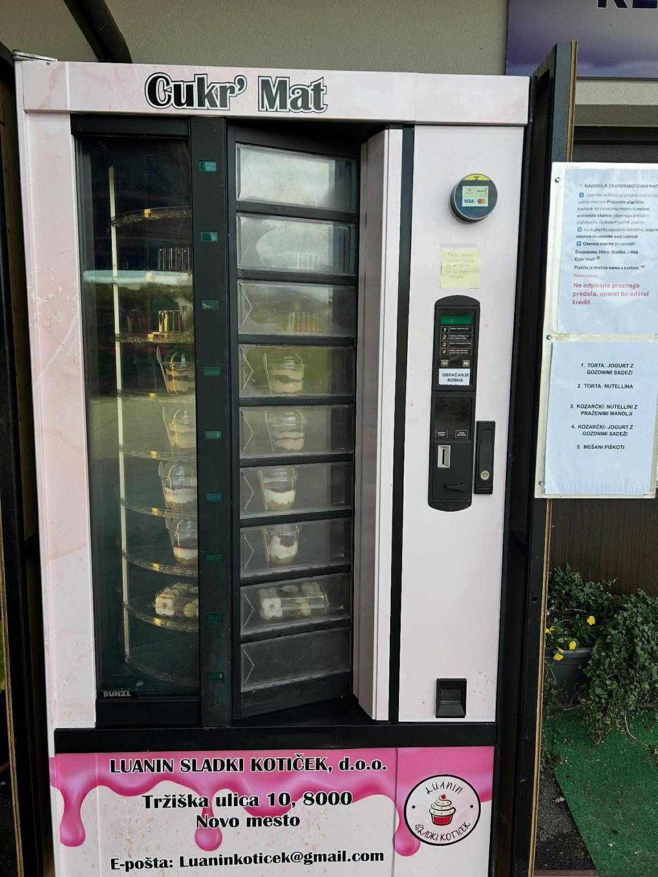 V Novo mesto je pred kratkim prišla prav posebna novost, ki je že navdušila mnoge ljubitelje sladkega. Na Tržiški ulici 10, pred kemično čistilnico, je zaživel prvi avtomat s sladicami v mestu – prikupno poimenovan Cukr'Mat, ki ga je postavilo podjetje Luanin Sladki Kotiček.
