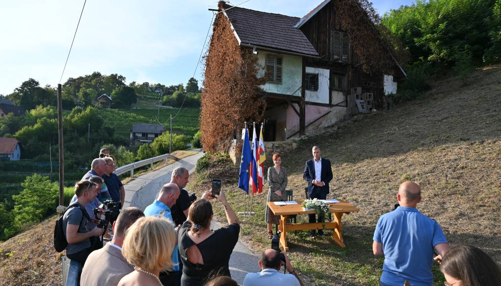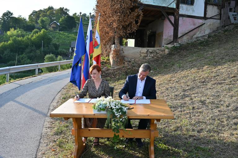 Ministrica za kulturo Asta Vrečko in župan Mestne občine Novo mesto Gregor Macedoni sta podpisala pogodbo o obnovi zidanice skladatelja Marjana Kozine na Trški gori nad Novim mestom.