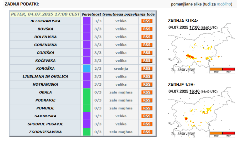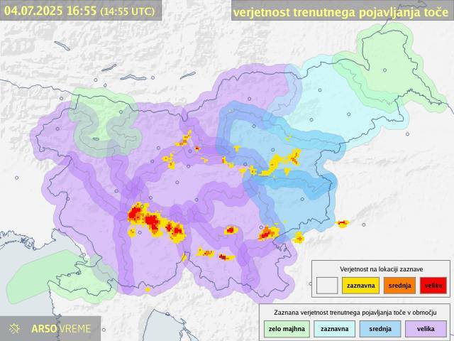 V Sloveniji danes prevladuje močna možnost neviht s točo, zato velja opozorilo, da se ta pojav lahko pojavi po vsej državi. Agencija za okolje že od dopoldne opozarja, da se bodo popoldne iz severa razširile intenzivne nevihte, ki jih spremljajo nalivi, ponekod pa tudi toča . MeteoAlarm za osrednjo Slovenijo izdaja opozorilo stopnje zmerne ogroženosti pred nevihtami, točo in močnim vetrom, kar vključno z Ljubljanskim in Savinjskim območjem označuje kot območja visoke verjetnosti toče .