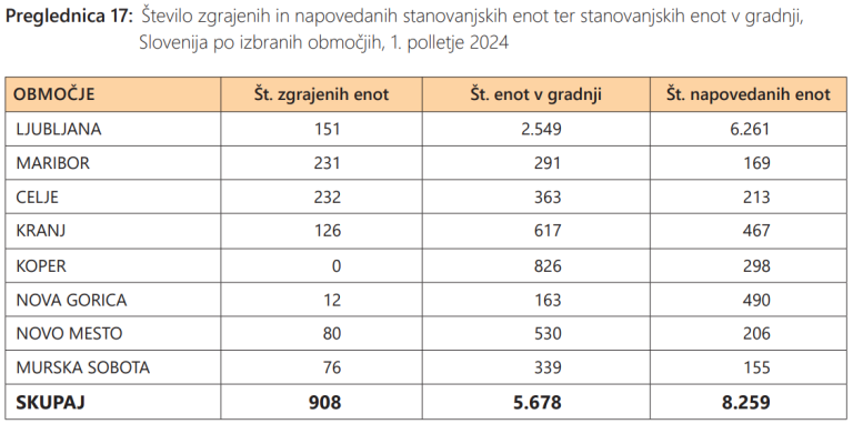 V prvi polovici leta 2024 je bilo v Sloveniji dokončanih okoli 900 novih stanovanj, večinoma v večstanovanjskih stavbah. Največ novih stanovanj je bilo zgrajenih na območju Maribora in Celja, sledi Ljubljana.