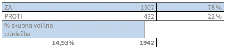 Od skupno 13.009 volivcev jih je glasovalo le slabih dva tisoč, kar pomeni, da je bila volilna udeležba manj kot 15-odstotna. Pa vendarle, odločitev volivcev je s skoraj 80 odstotki podprla ustanovitev Javnega zavoda za pomoč in oskrbo na domu, proti pa je glasovalo le dobrih 400 ljudi oziroma 20 odstotkov.
