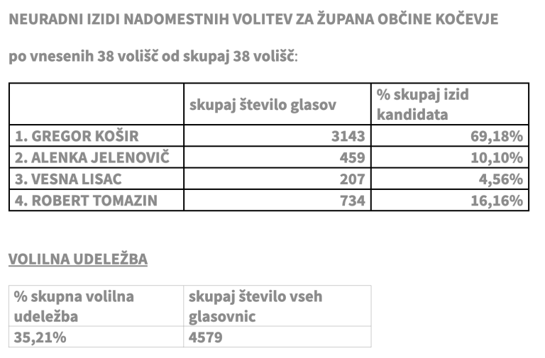 Na nadomestnih volitvah za župana Kočevja zmaga Gregorju Koširju.