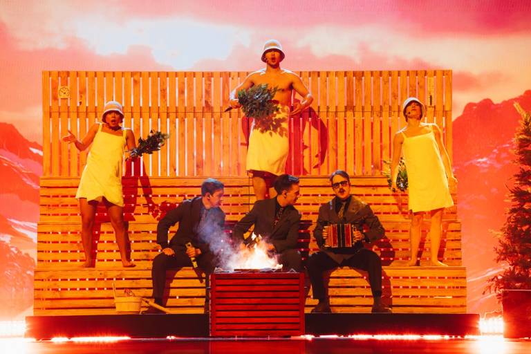 Sledili so Švedi, ki se omenjajo tudi med favoriti za končno zmago. KAJ so s skladbo Bara Bada Bastu na oder prinesli vročino. Začelo se je s posnetkom iz gozda, tabornega ognja in klobase. Taborni ogenj se je nato prelevil v savno, plesalci pa so zamenjali kostume za bele brisače. Med refrenom so mimo LED-zaslona švigali jeleni. Savna se je nato razširila po celotnem odru, v ozadju se je prikazal velik termometer. Nastop se je končal z značilno pozo šesterice nastopajočih.