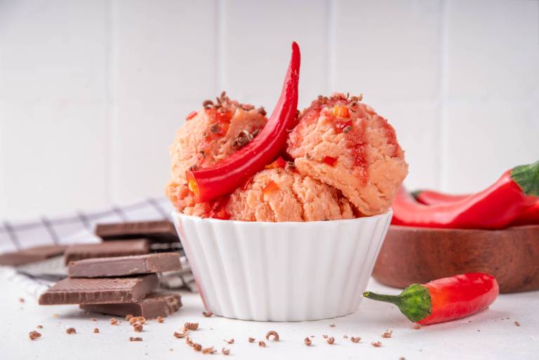 Smetano, mleko in sladkor segrejte do vretja. Odstavite, dodajte nasekljano čokolado in mešajte, dokler se ne stopi. Dodajte cimet in čili. Ohladite zmes, nato jo zamrzujte po postopku brez aparata. Postrezite s koščki temne čokolade ali ščepcem morske soli.