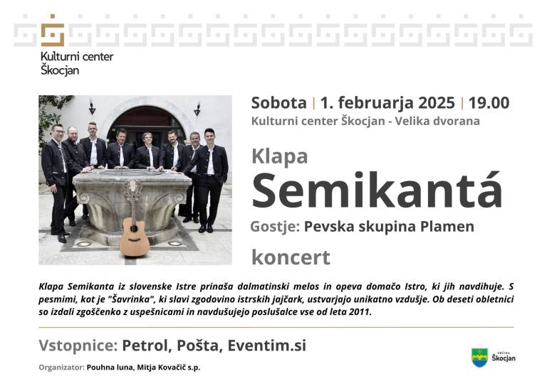 Ob 19. uri bo v Kulturnem centru Škocjan koncert Klape Semikantá, kjer bo kot gost nastopila tudi pevska skupina Plamen.