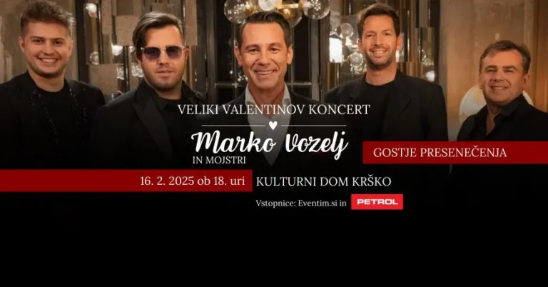 Ob 19. uri se bo v Športni dvorani Krško Veliki Valentinov koncert Marka Vozlja & Mojstrov, ki bo s svojimi uspešnicami pričaral nepozaben glasbeni večer.