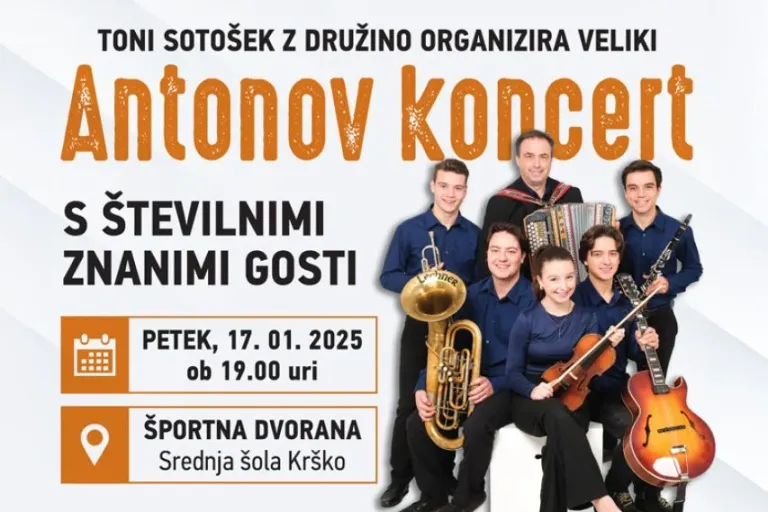 Ob 19. uri bo v Športni dvorani srednje šole Krško potekal Antonov koncert Tonija Sotoška. Priznani harmonikar bo skupaj z družino in znanimi gosti pripravil glasbeni spektakel, ki bo zagotovo navdušil ljubitelje domače glasbe.