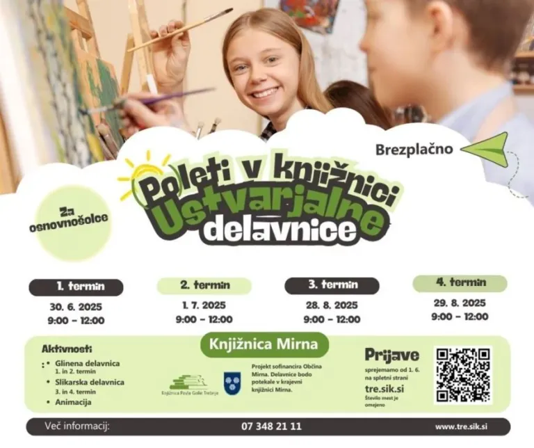 V petek, 4. julija, se bo ob 9. uri v Krajevni knjižnici Mirna začela ustvarjalno-likovna delavnica Po(leti) v knjižnici, ki jo bo vodila akademska slikarka Damijana Bijek.