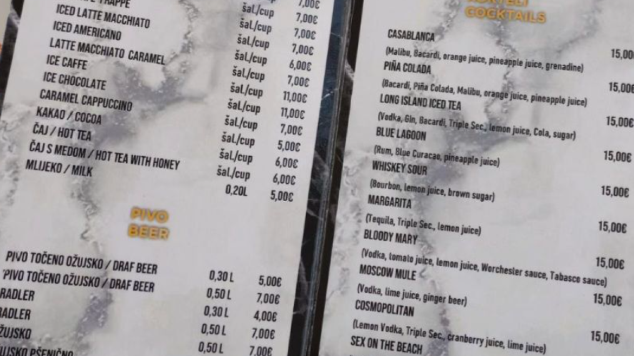 Na fotografiji, ki je zaokrožila po spletu, je viden cenik iz enga izmed barov v središču Poreča, kjer obiskovalci za običajne jedi in pijačo plačujejo več kot v elitnih evropskih prestolnicah.
