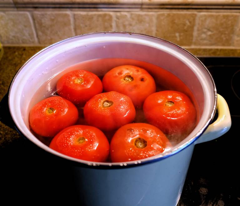 Paradižnike najprej na spodnji strani rahlo zarežite v obliki križa, nato jih za pet do deset sekund potopite v vrelo vodo.