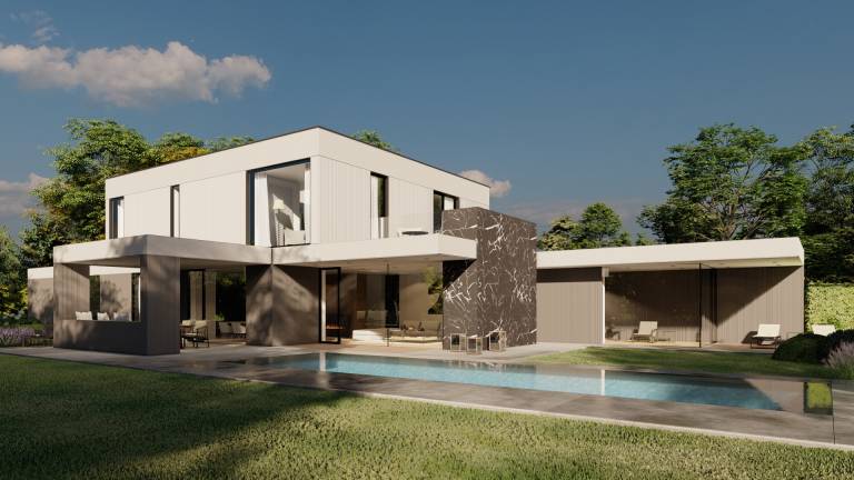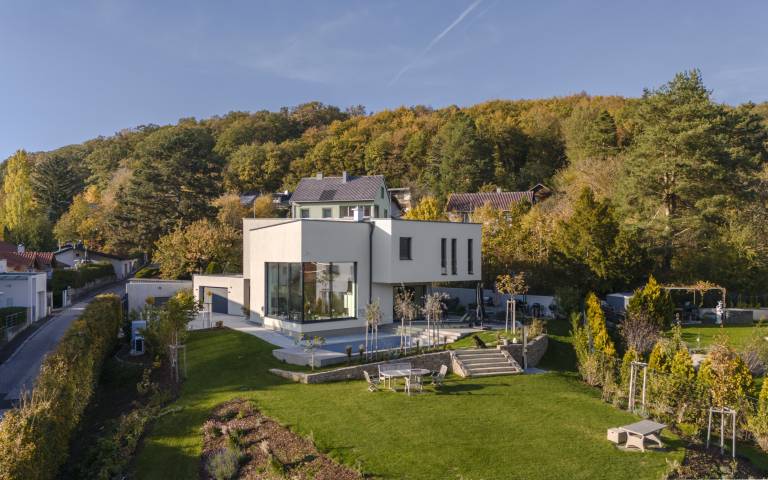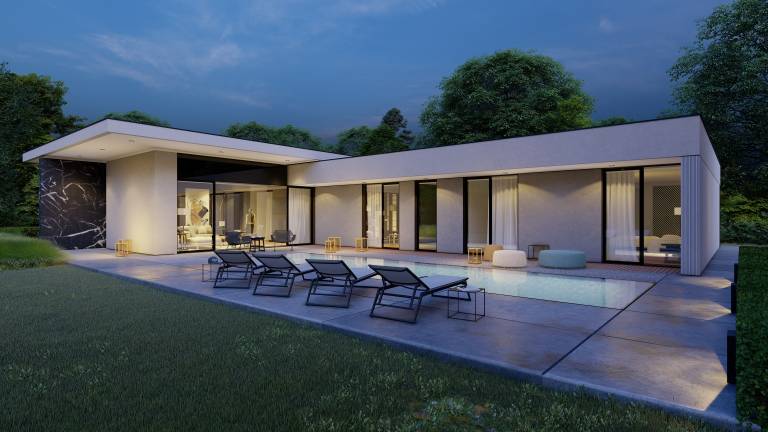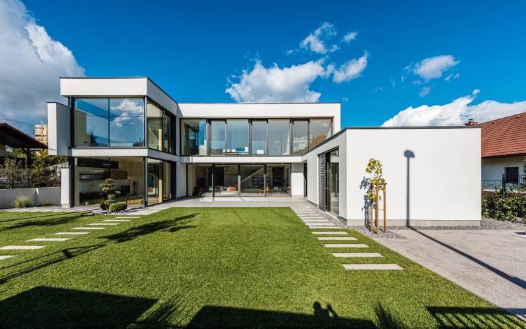 - Sodobno zasnovana pritlična hiša, ki s svojo kompaktno in funkcionalno zasnovo ponuja izjemno bivalno udobje in se smiselno navezuje na zunanjost.