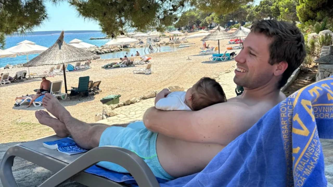 Glasbenik in vodja ansambla Saša Avsenika je z družino na dopustu, kjer mu družbo dela tudi novorojenček.