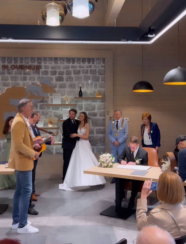 Ta se je zgodila minulo soboto, ko sta si Monika in Anže izmenjala poročni zaobljubi na cerkvenem obredu na Brezjah, kjer so jima zapeli člani glasbene senzacije Perpetuum Jazzile, in so z razlogom, saj sta se spoznala pred šestimi leti, ko sta skupaj z vokalisti sodelovala na koncertu Simfonična ekstaza pod dirigentsko taktirko Roka Goloba.
