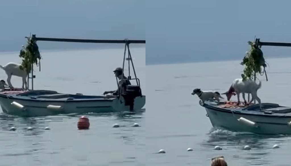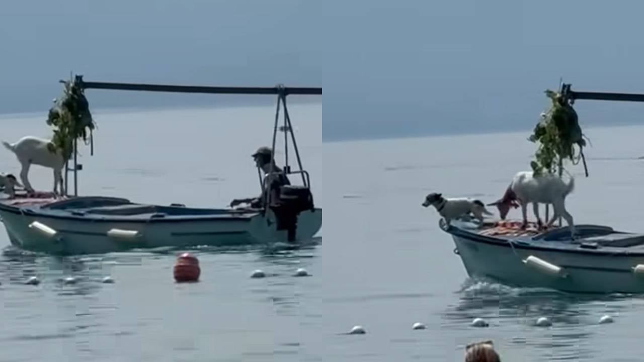 Na manjšem čolnu ob dalmatinski obali so opazili nenavadno druščino – kozo in psa, ki skupaj s svojim lastnikom plujeta po morju. Posnetek prikazuje mirno plovbo, medtem ko živali opazujejo okoliško vodno površino, lastnik pa ju varno usmerja.