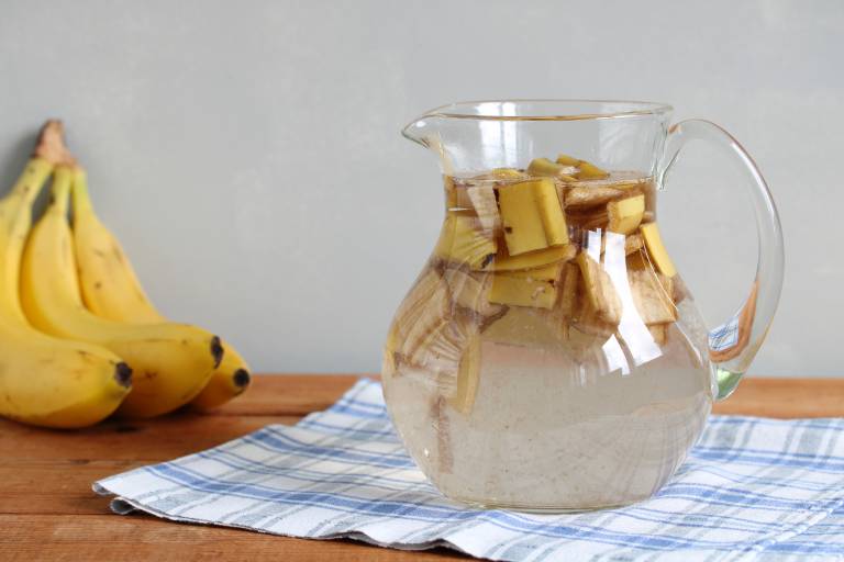 Druga možnost je priprava bananine vode: olupke namočite v vodo za 24 do 48 ur, nato tekočino precedite in uporabite za zalivanje ali škropljenje rastlin.