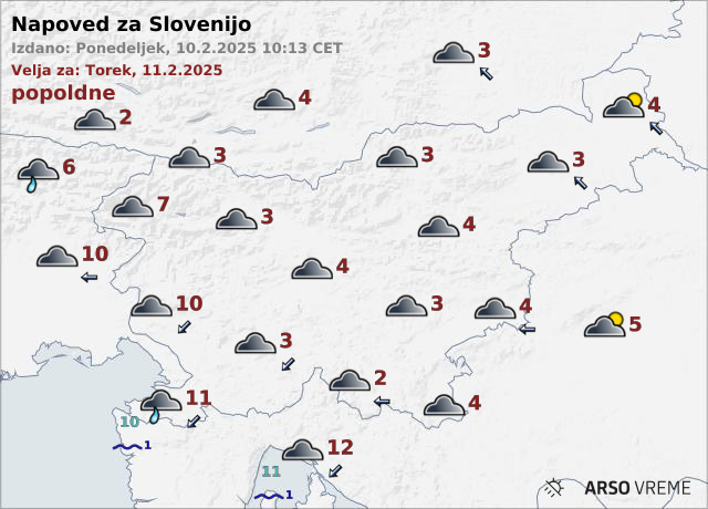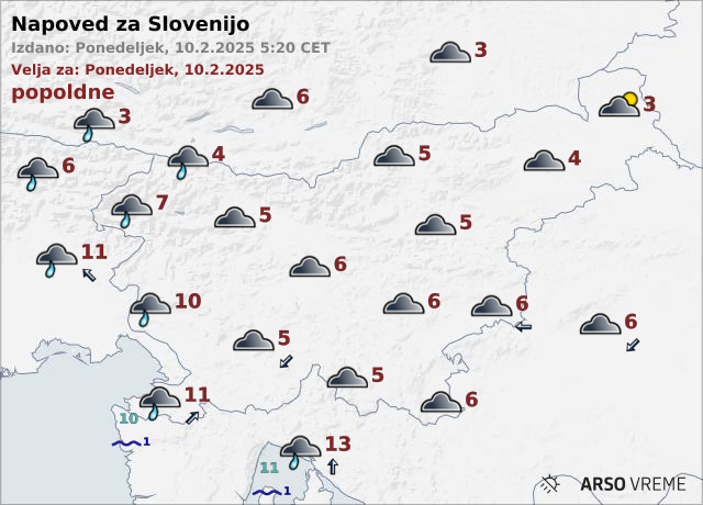 Najvišje dnevne temperature bodo od 3 do 7, na Primorskem okoli 11 stopinj Celzija. Zvečer in v prvem delu noči bodo rahle padavine možne tudi drugod po Sloveniji.