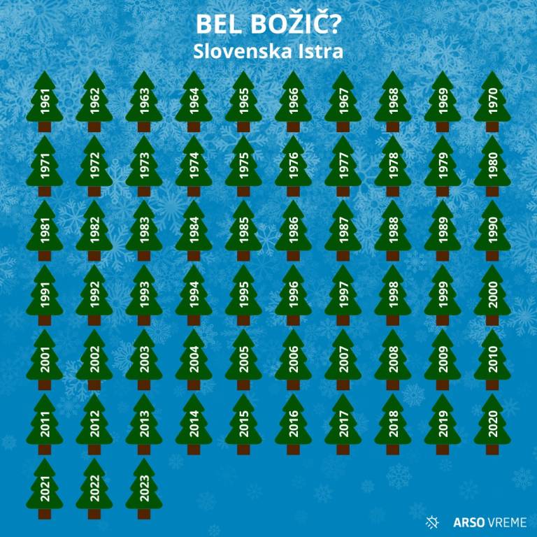 Vremenoslovci agencije za okolje so pripravili pregled »zelenih« in »belih« božičev v Biljah, Ratečah, Slovenj Gradcu, Mariboru, Murski Soboti, Celju, Novem mestu, Ljubljani, Kredarici in Slovenski Istri.