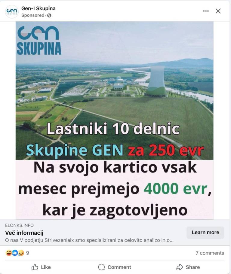 »Lastniki 10 delnic Skupine GEN za 250 evrov na svojo kartico vsak mesec prejmejo 4000 evrov, kar je zagotovljeno,« obljublja objava, ki kroži na družbenem omrežju Facebook. A pozor, gre za prevaro.