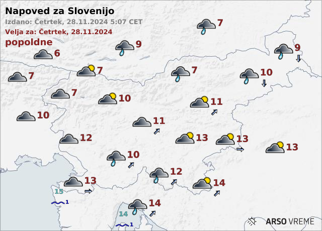 Popoldne se bo oblačnost od severa zgostila. Proti večeru bodo rahle padavine zajele večji del Slovenije. Najvišje dnevne temperature bodo od 7 do 14 stopinj Celzija.