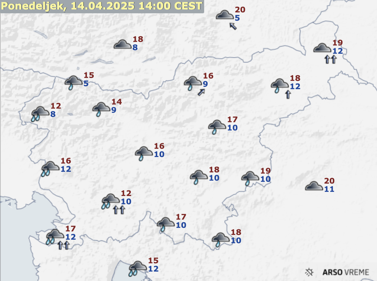 V ponedeljek bo večinoma oblačno. Občasno bo deževalo, pogosteje na zahodu. Na severovzhodu bo večinoma suho. Ob morju bo pihal jugo, ponekod v notranjosti jugozahodni veter.