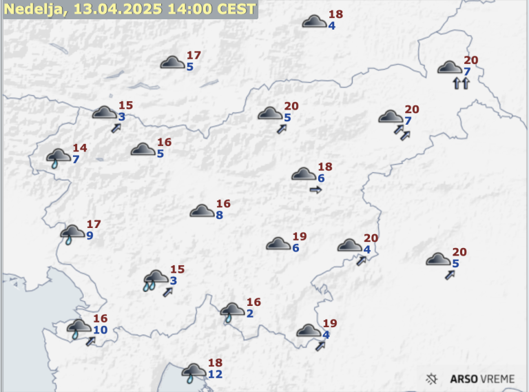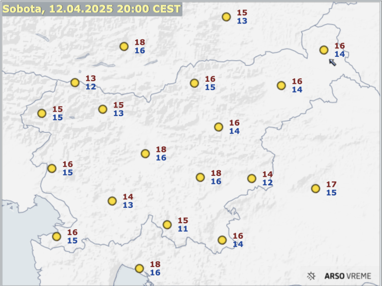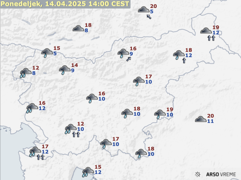 Jutri zjutraj se bo od zahoda pooblačilo. Sredi dneva bo v zahodni in osrednji Sloveniji začelo rahlo deževati. Pihal bo okrepljen jugozahodni veter, ob morju jugo. Najnižje jutranje temperature bodo od 3 do 9, najvišje dnevne od 14 do 18, na vzhodu do 21 stopinj Celzija.