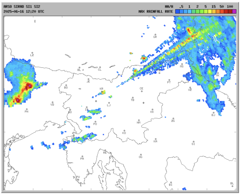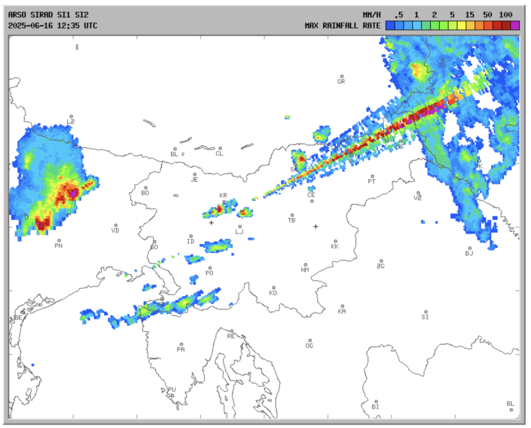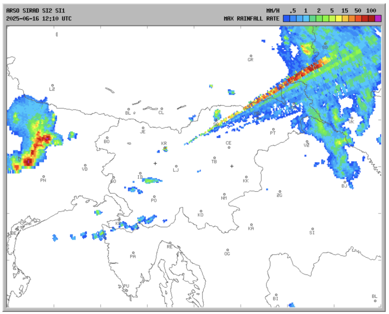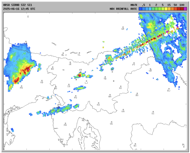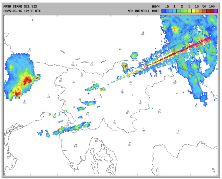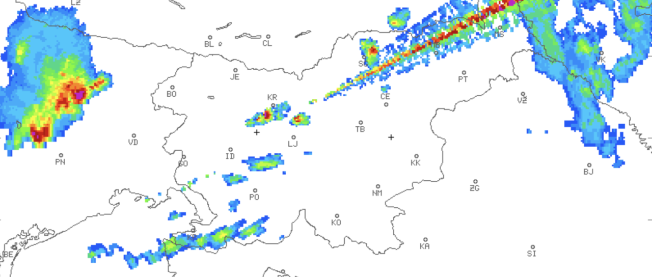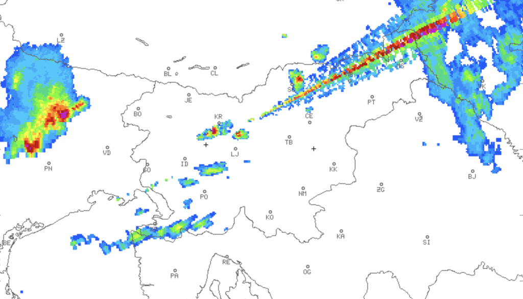Na animaciji intenzitete padavin se je pojavila nenavadna anomalija – izgleda, kot da bi na nevihte streljali z laserjem.