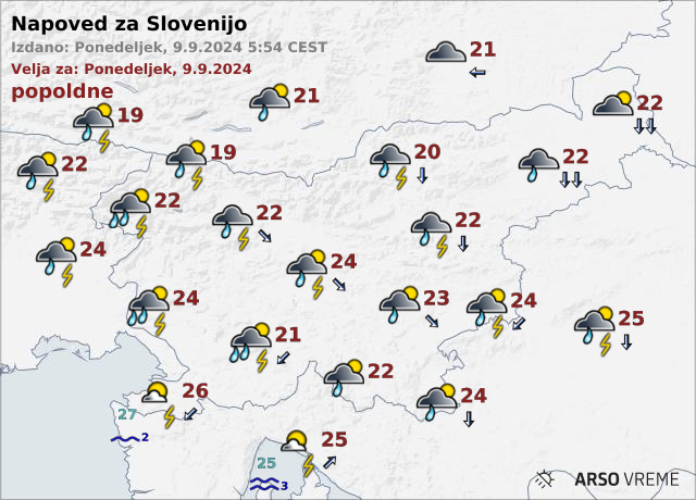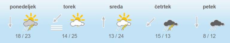 Vremenoslovci Agencije za okolje napovedujejo, da bo danes spremenljivo oblačno s krajevnimi padavinami, deloma nevihtami, ki bodo do večera od severozahoda ponehale. Sprva bo pihal jugozahodnik, popoldne bo zapihal severnik, zvečer na Primorskem burja. Najvišje dnevne temperature bodo od 19 do 24, ob morju do 26 stopinj Celzija. Popoldne se bo ohladilo.